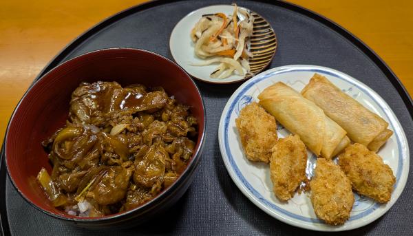 昨日の夜は牛カルビ丼、カキフライ、春巻きだった。