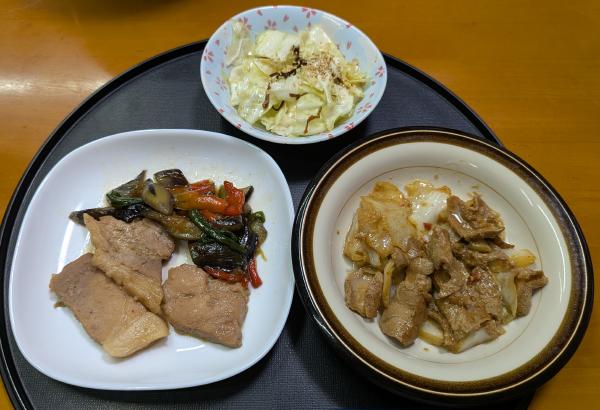 昨日の夜はシューマイと揚げナスとベーコン炒めだった。