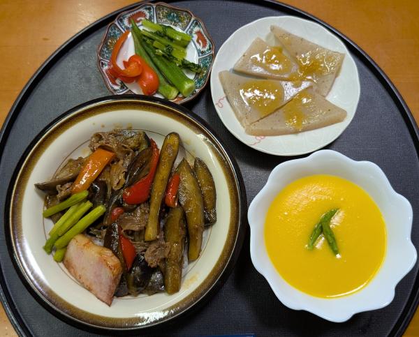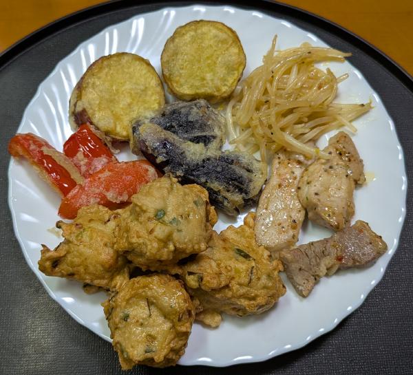 昨日の夜はすりみ揚げ、ナス、パプリカ、サツマイモの天ぷら、もやし炒め、焼肉だった。