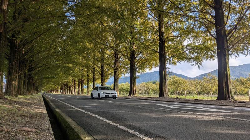 早めに出発したおかげでメタセコイア並木で三男のcivicの車を走らせながら真理子と撮影。