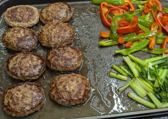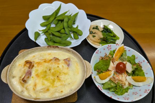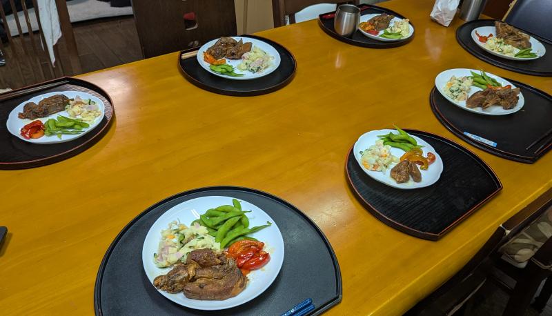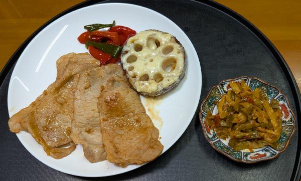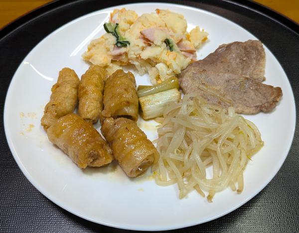 昨日の夜はネギとえのきの肉巻き、ポークソテー、ポテトサラダ、もやし炒めだった。
