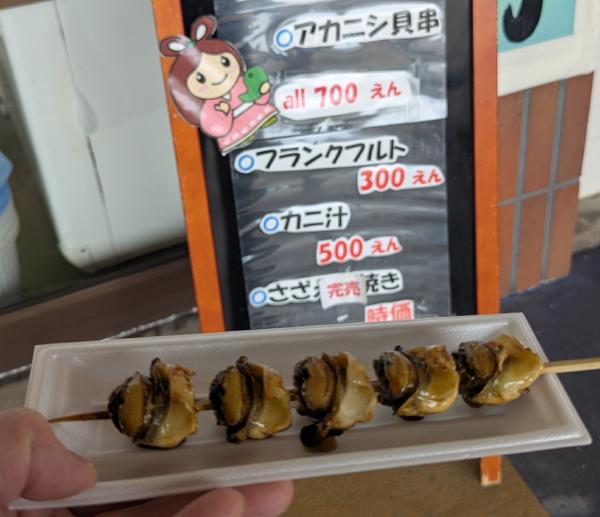 まずは道の駅kokoくろべで軽食を、道の駅親不知ピアパークでアカニシ貝を頂く。