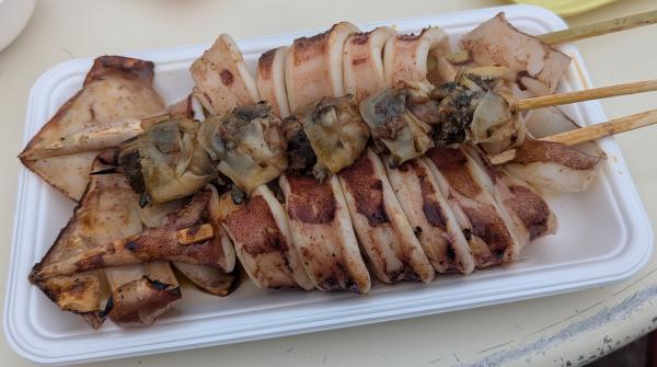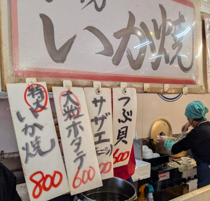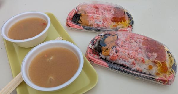 道の駅マリンドーム能生では海鮮ちらし寿司、カニ汁、特大いか焼き、アカニシ、ソフトクリーム。