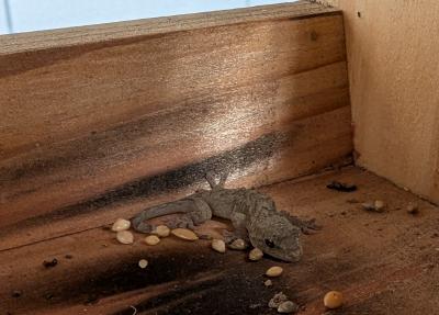 餌箱の下に小さくて可愛いヤモリが隠れていた。