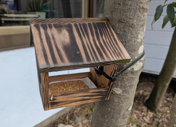 リビングの横の庭木に付けてある野鳥餌台の餌を交換した。
