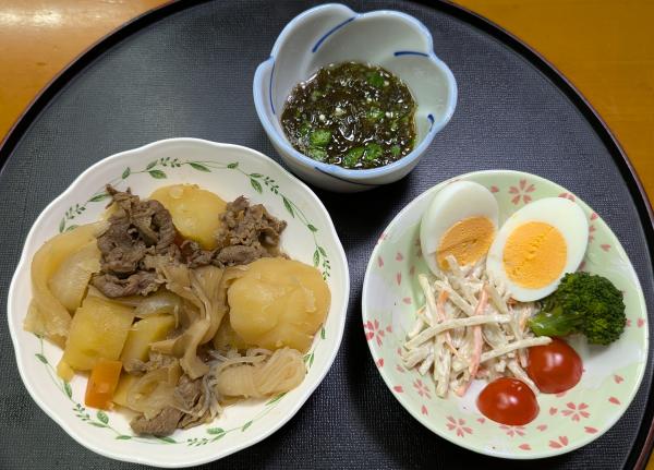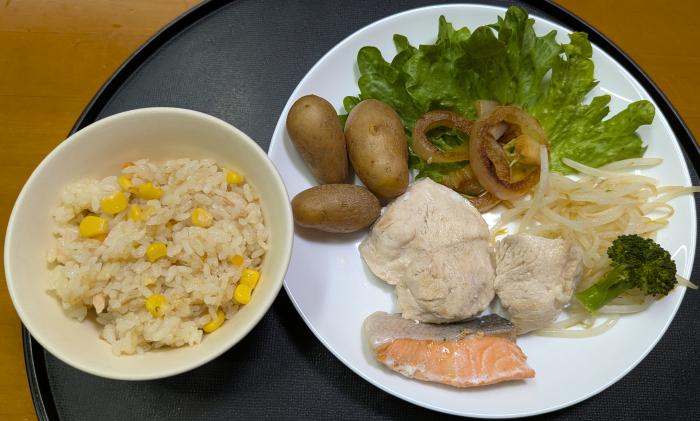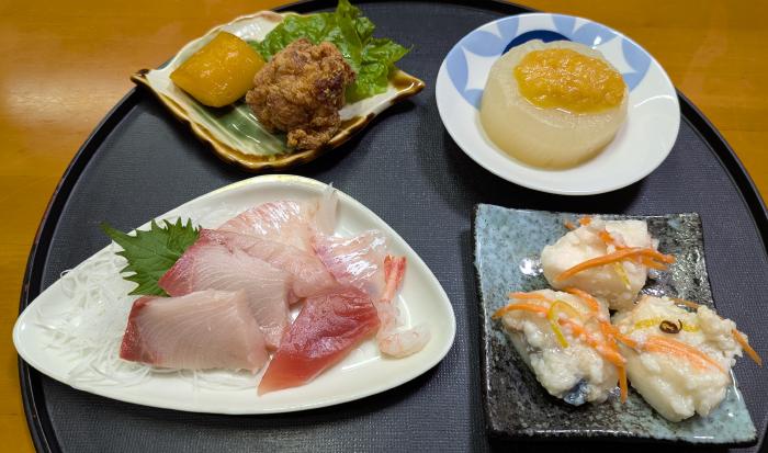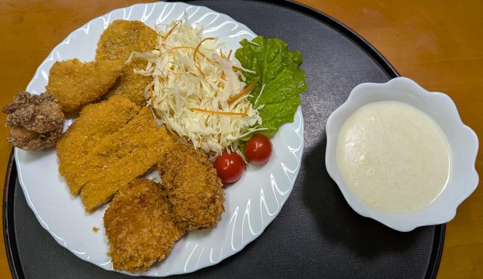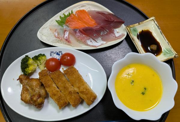 昨日の夜はとんかつ、鶏のから揚げ、刺身、かぼちゃスープだった。