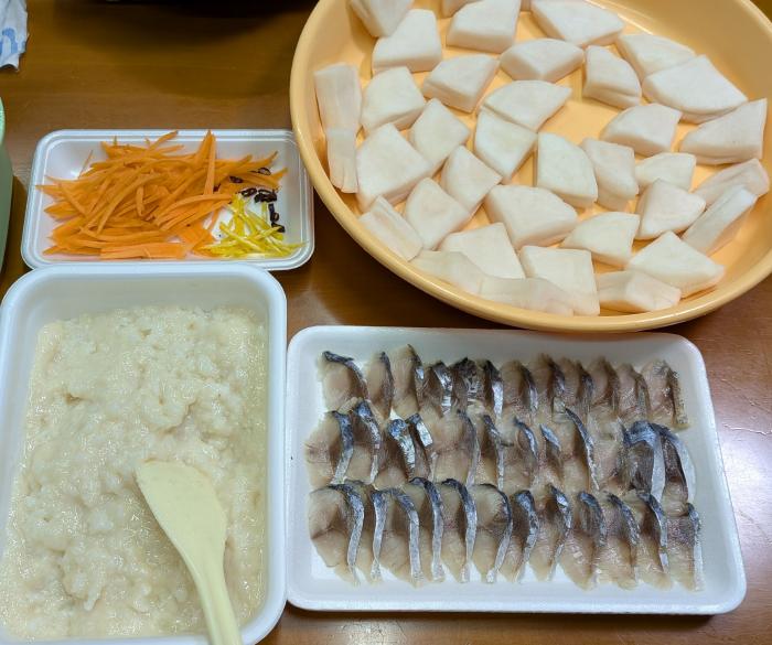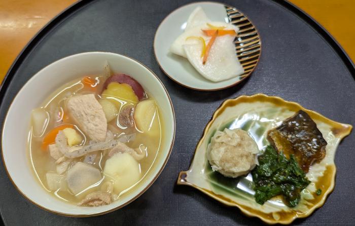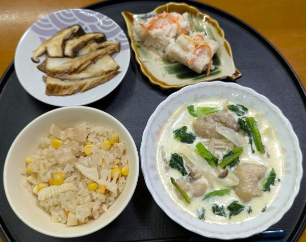 昨日の夜はチキンのクリーム煮、炊き込みご飯、焼きしいたけ、かぶら寿司だった。