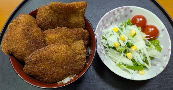 昨日の夜は生協のソースかつ丼と野菜サラダだった。
