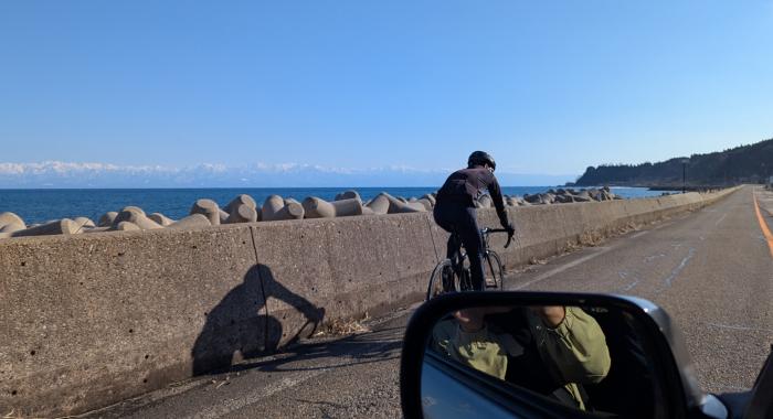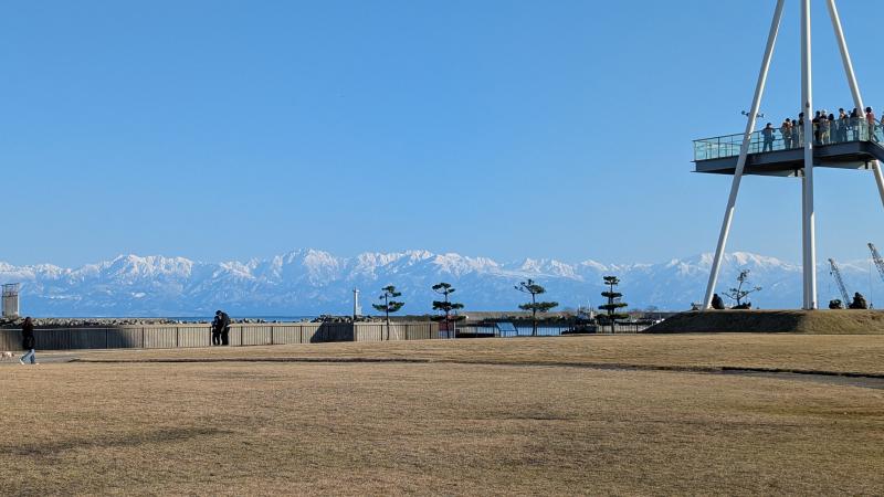 海岸線を走り九殿浜園地に寄って立山連峰を眺める。