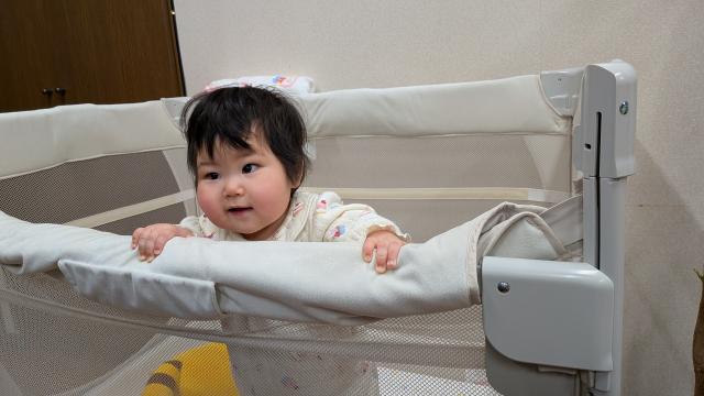 先月から事務所にベビーベッドをおいて時々愛想を振りまいてくれる。