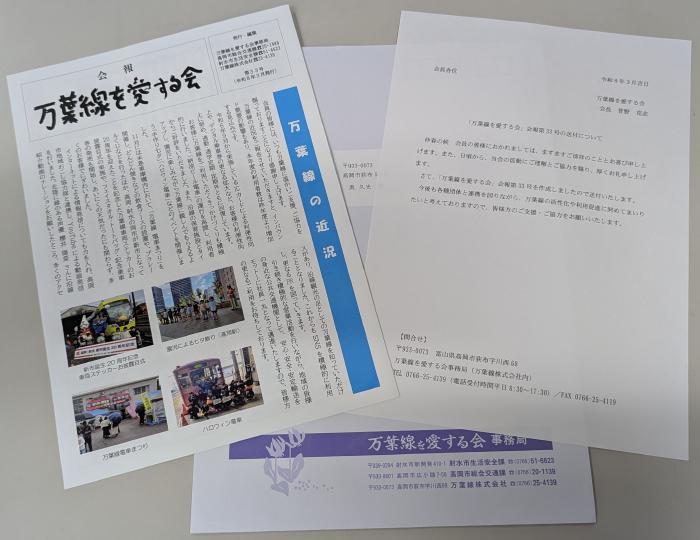 万葉線の近況や万葉線を愛する会の収支報告、NEWS、新規協力店など書かれていた。