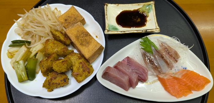昨日の夜は刺身、カレーポークカツレツ、ネギ焼き、厚揚げ、もやし炒めだった。