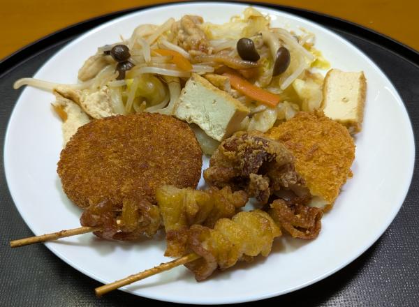 昨日の夜は野菜炒めとアルビスの総菜や鶏串だった。